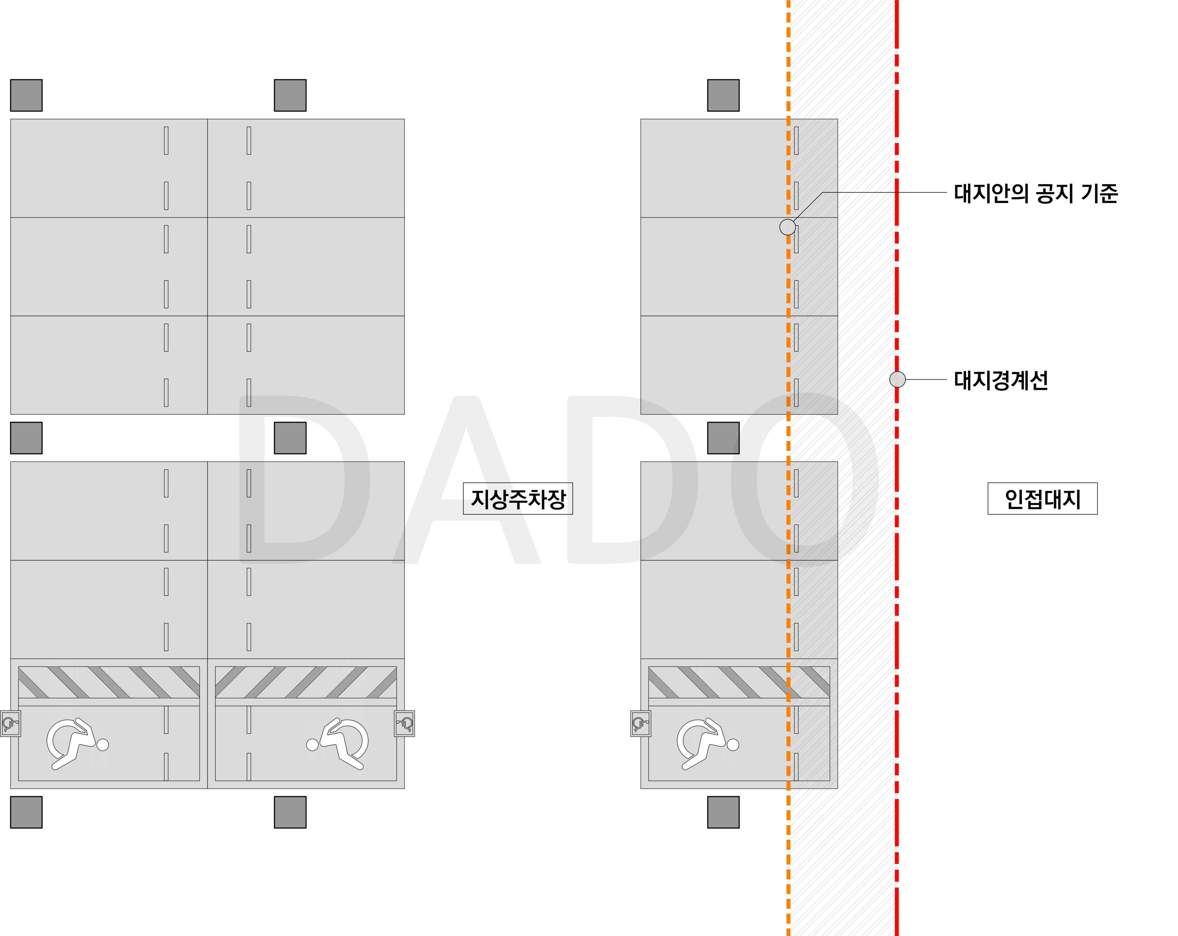 대지경계선으로부터 이격 시키면 될 것입니다. 참고사항으로 건축물의 부속된 주차장,