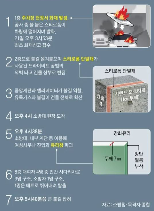 화재는 지상 1층 주차장에서 발생한것으로 보이며, 화재는 순식간에 8층 건물 전체를 뒤덮게 되었습니다.